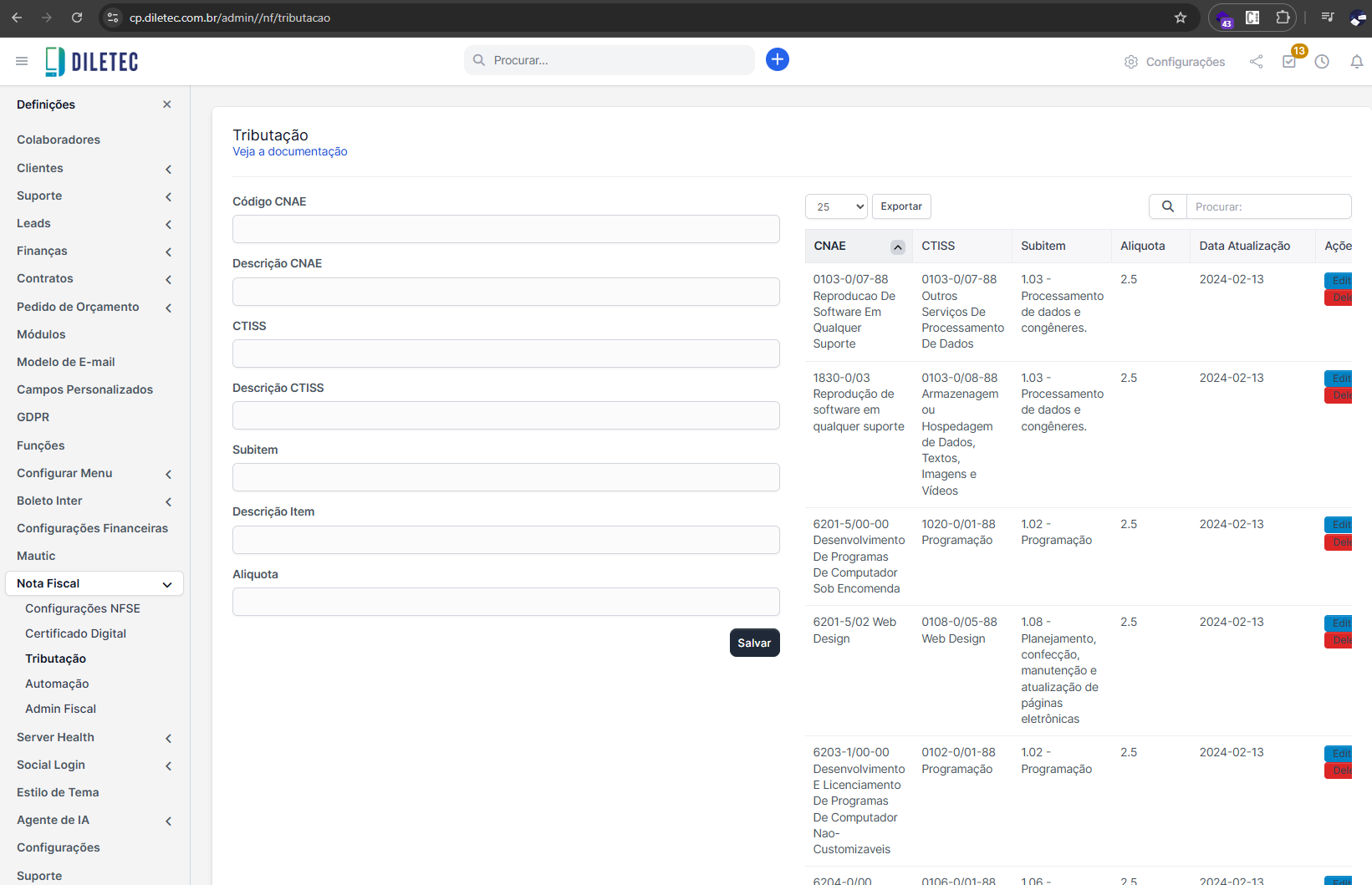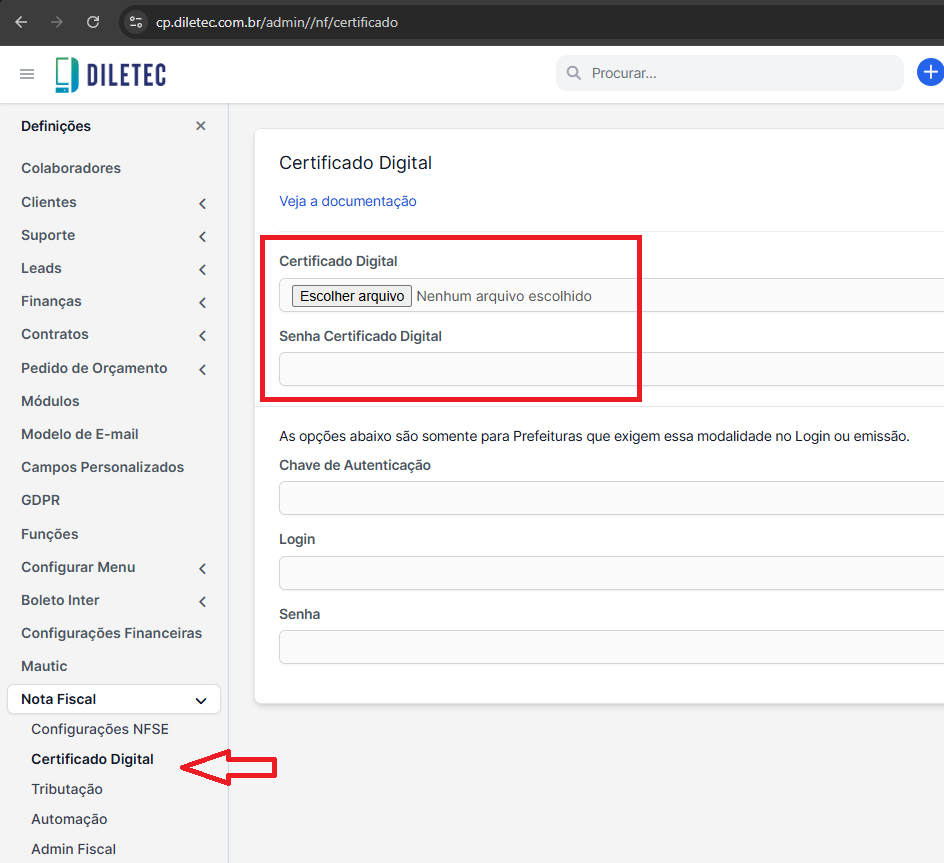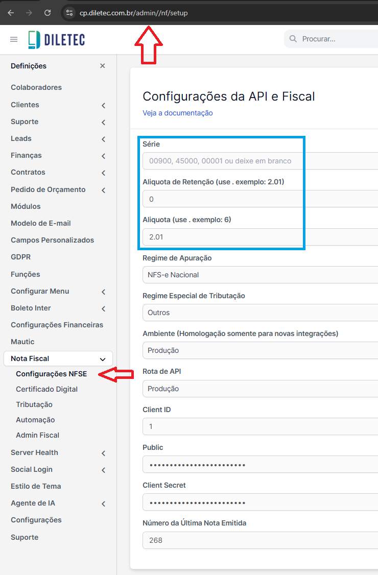 Homologação significa que a NFSe não terá valor, pois você está realizando um teste. - Rota de API: Aqui seria o nosso servidor. Deixe em PRODUÇÃO, a menos que a equipe Diletec estiver realizando alguma integração diferente para o seu município.
