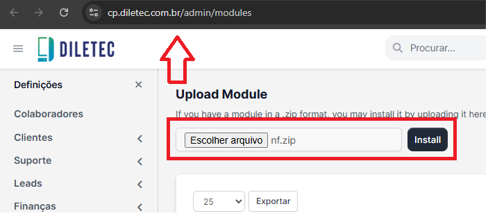 - Atualize o Módulo acessando o painel Admin do seu Perfex CRM > Definições > Módulos > Upload Module > Clique em Install.