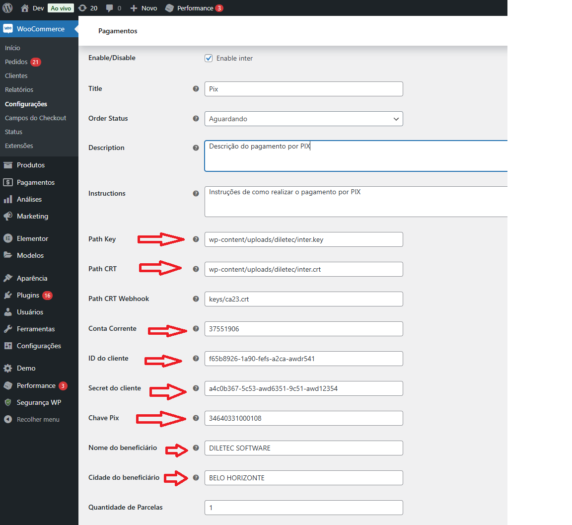 Em seguida vamos configurar o Path CRT: wp-content/uploads/diletec/inter.crt