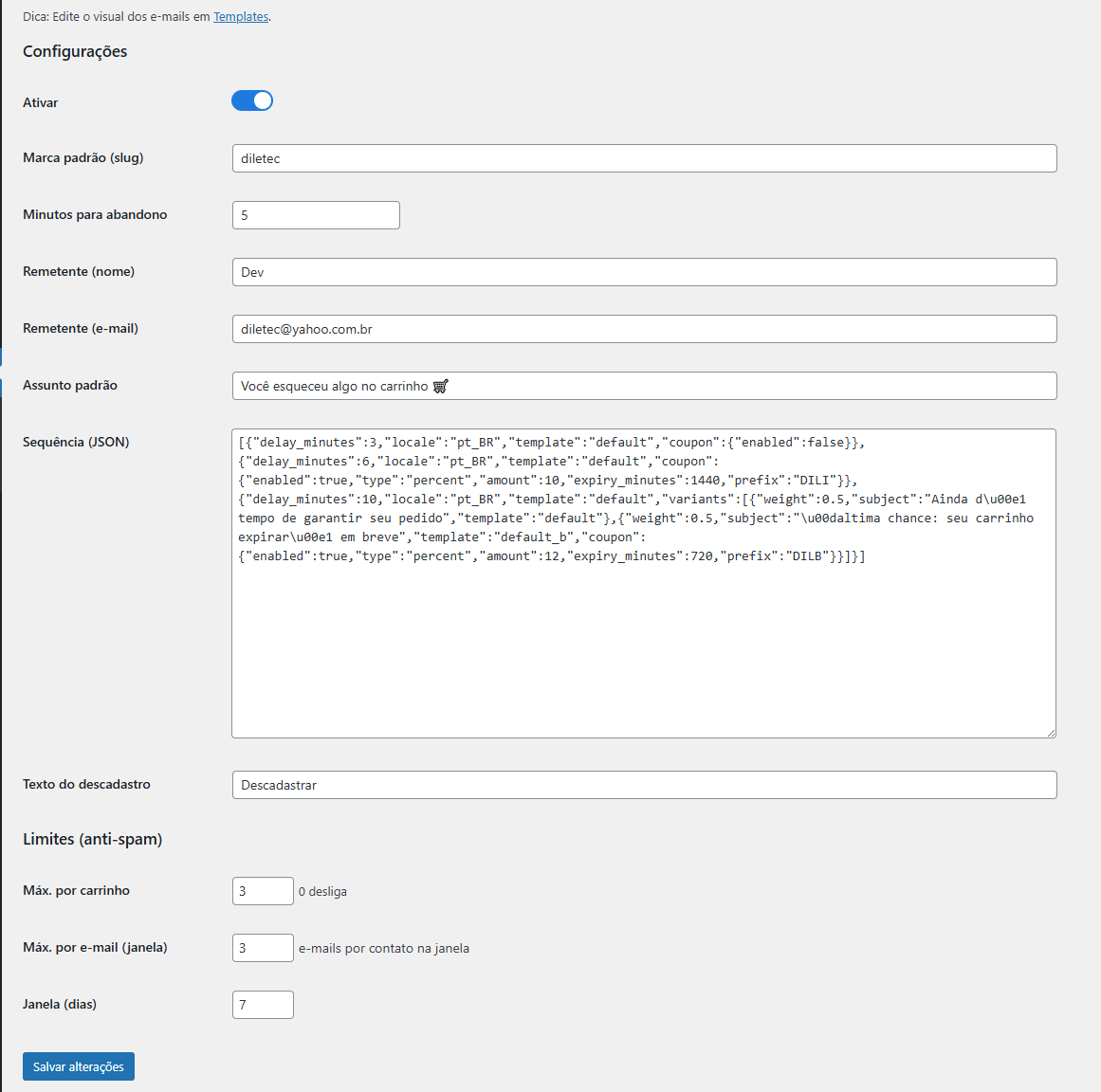 - Limites anti-spam (cap): defina máximos por carrinho e por e-mail/Janela — evite excesso de envios e descadastros.