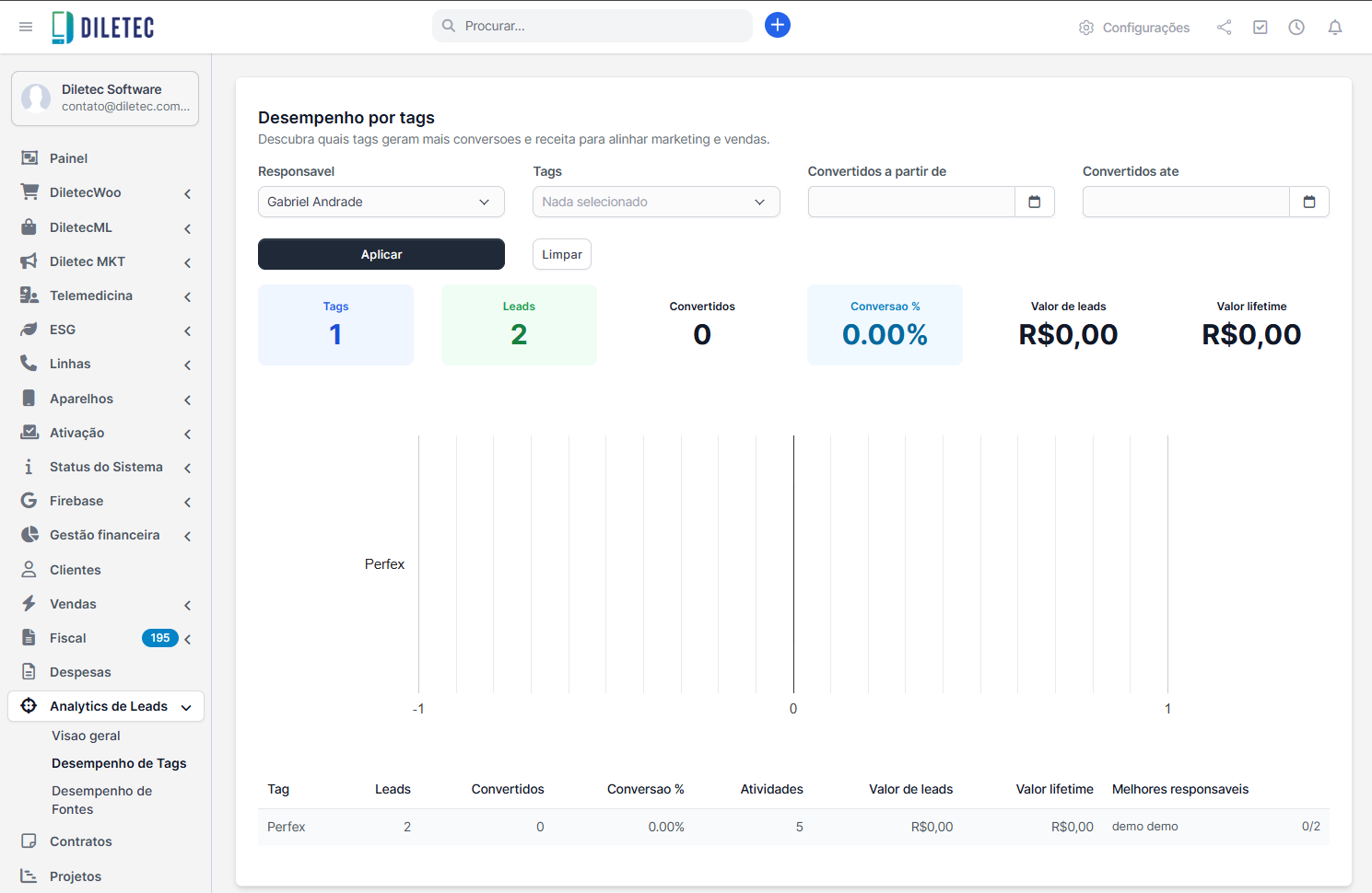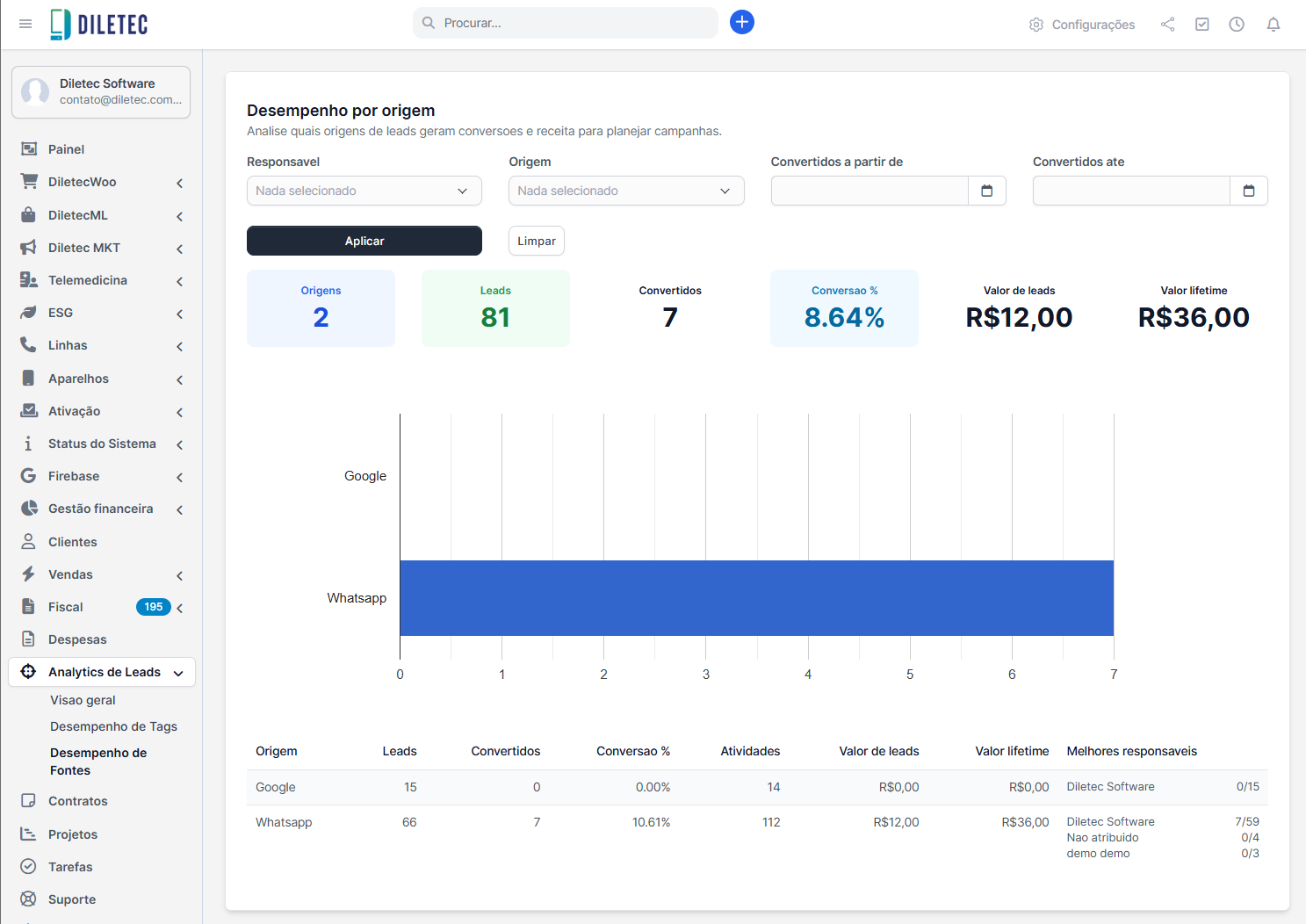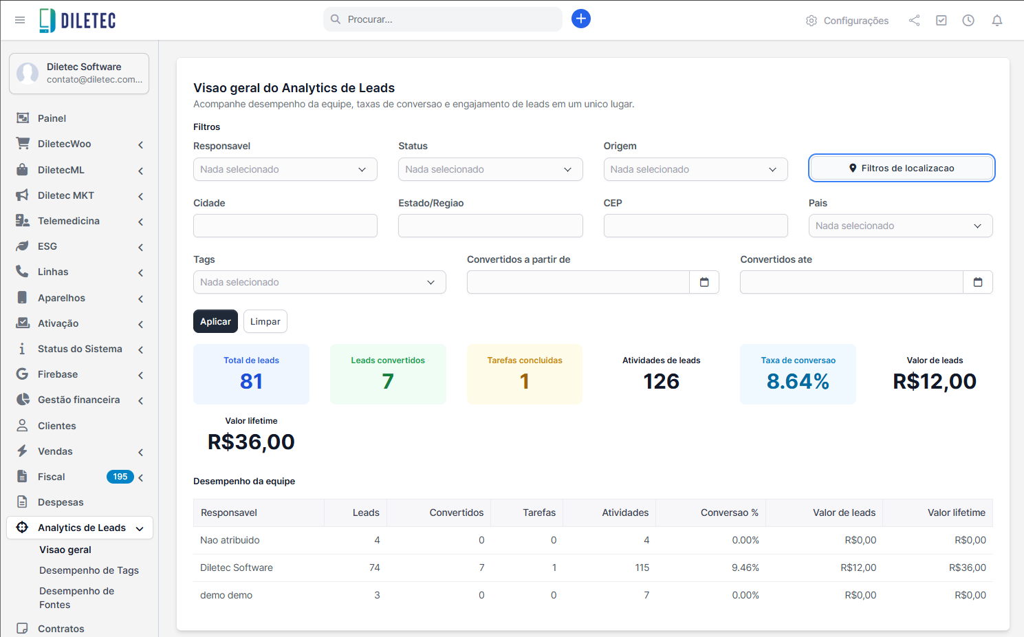 Cada lead sem acompanhamento é dinheiro na mesa. Com o Diletec Leads Analytics, você enxerga em minutos quem está performando, quais origens e tags geram clientes e onde o funil trava — sem planilhas, sem configurações complexas e sem novas tabelas no banco de dados.