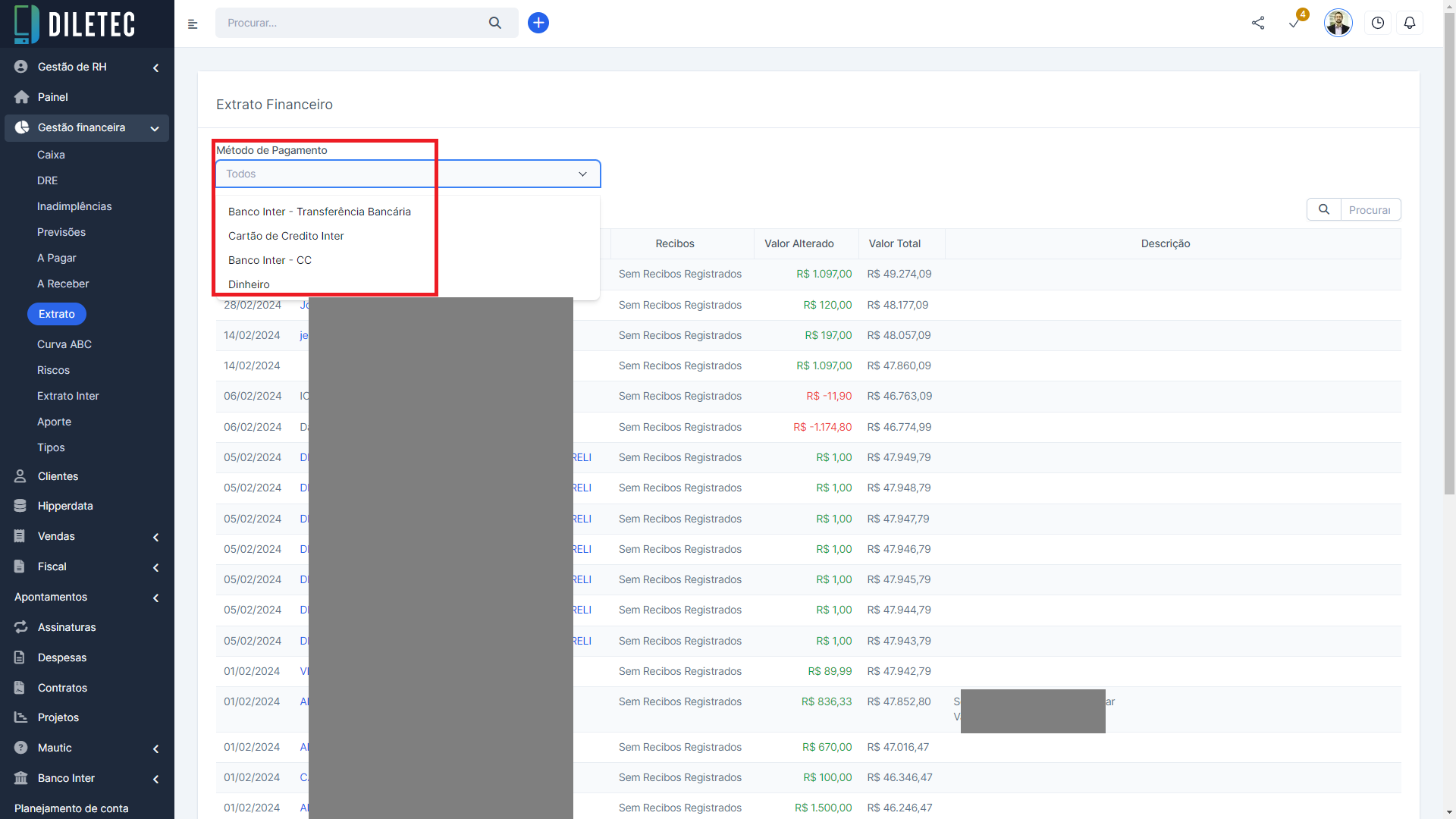 Integração de Extrato com o Banco Inter, ajudando em lançamentos de despesas e receitas.