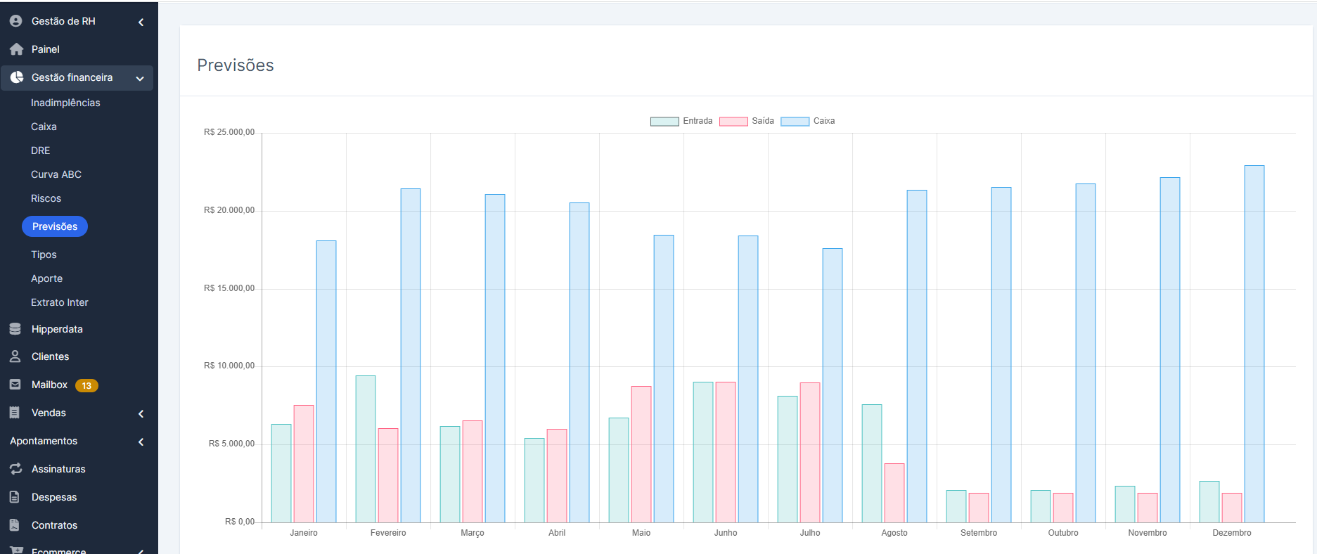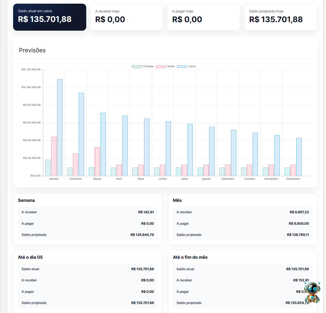 O Menu Caixa te mostra a situação do ano vigente, o caixa da empresa, as propostas e os orçamentos.